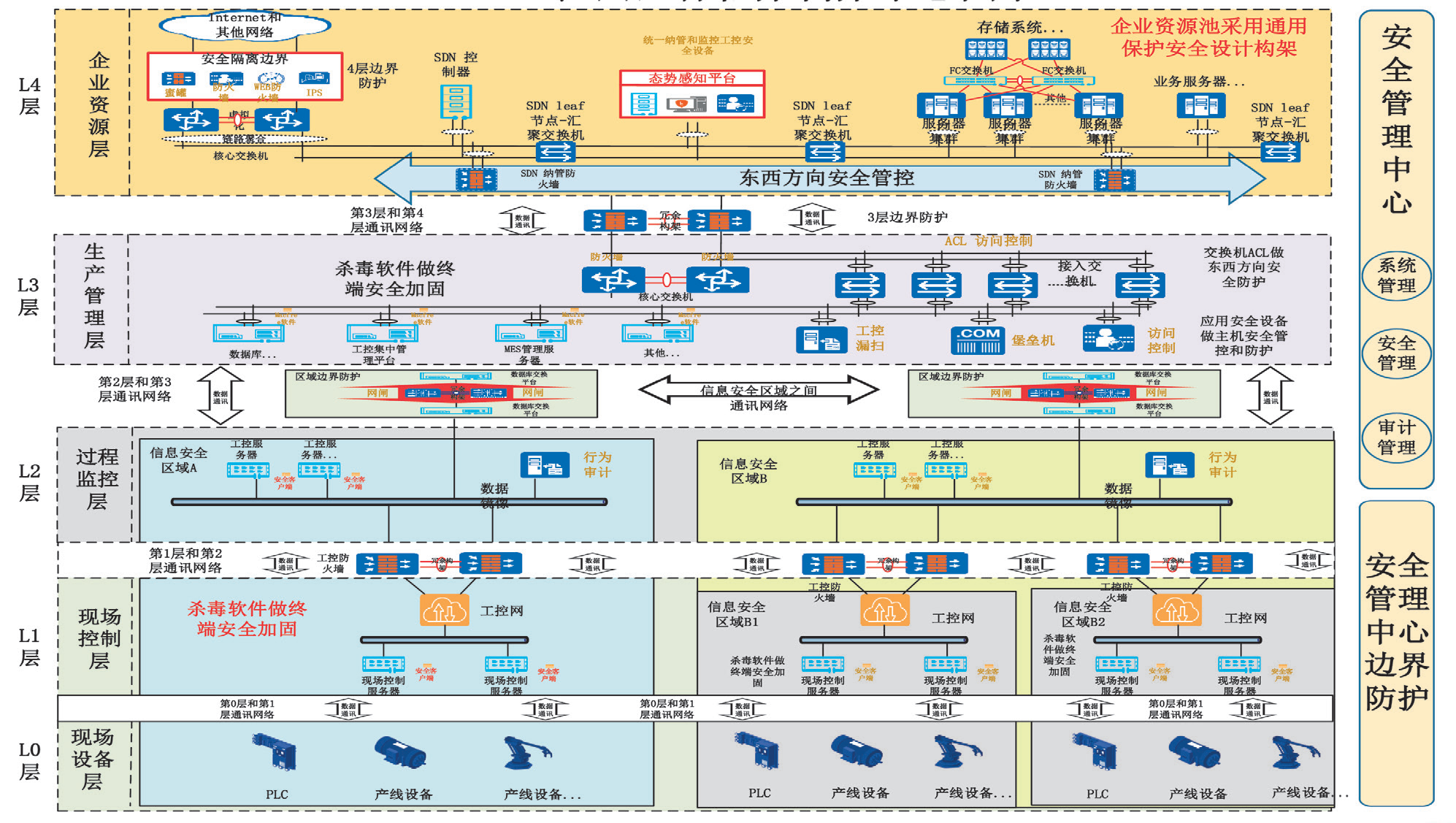 4、安全集中管控:工控網和MES網系統管理、審計管理、安全管理、集中管控通過統一安全平臺統一管理和下發相關安全策略。