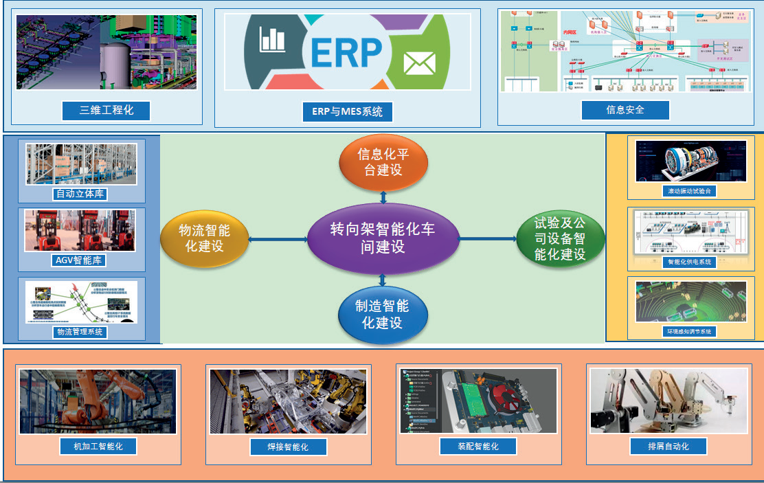 轉向架智能化車間信息化平臺建設,需要以信息化平臺為基礎,擴展數字化設計、工藝、制造一體化平臺,深化三維工程化應用; 建立 MES 系統,打通 MES 與 ERP、三維工程化數據連接,要求實現智能化制造;引入智能化立體倉庫、倉儲管理系統(WMS)、AGV 小車控制系統與物流仿真系統等現代化物流手段, 實現智能化物流;增加在線檢測和過程質量控制系統,提升產品質量控制手段。